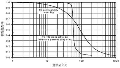 此外,電感磁芯材料也是選擇電感時應(yīng)該加以考慮的重要因素。常用的磁芯材料分為兩大類,一類是粉狀磁芯,以鐵粉芯、High Flux高磁通磁粉芯以及Kool Mμ為代表;另一類是鐵氧體磁芯。兩種磁芯材料各有優(yōu)缺點(diǎn),設(shè)計人員在選擇的時候,應(yīng)根據(jù)成本、性能、尺寸等因素綜合考慮進(jìn)行選擇。相對粉狀磁芯電感,鐵氧體磁芯的電感具有較低的磁芯損耗,同時具有較高的開關(guān)頻率(高達(dá)MHz)。因此,鐵氧體磁芯通常是此類應(yīng)用的最佳選擇。當(dāng)然,鐵粉磁芯也有其優(yōu)越性,例如鐵粉磁芯的成本相對鐵氧體要低得多;另外,粉狀磁芯的電感隨著流過電感的直流偏置電流的變大要下降得緩慢些,相當(dāng)于具有“軟”飽和特性,而鐵氧體磁芯的電感值在飽和以后就會迅速下降(見圖1),因此在設(shè)計的時候需要留有更多的余量,防止電感出現(xiàn)飽和。如圖1所示,粉狀磁芯的電感值隨著負(fù)載電流的增大下降相對緩慢。鐵粉磁芯往往是用于一些對功耗要求不甚敏感,開關(guān)頻率也不高(<200kHz),但注重成本的應(yīng)用場合。