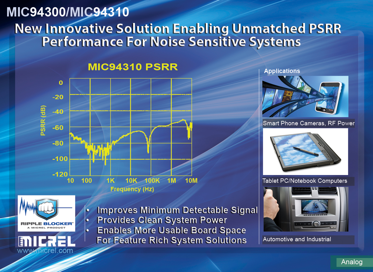 模擬、高帶寬通信及以太網(wǎng)集成電路(IC)解決方案領域的行業(yè)領導者麥瑞半導體(Micrel Inc.)近日發(fā)布了Ripple Blocker系列IC,包括MIC94300電壓跟隨輸出IC和MIC94310固定輸出(LDO)IC。