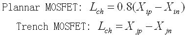 可見閾值電壓主要與基區(qū)摻雜濃度(p-)、柵氧化層厚度(Toxg)、耗盡層電荷(Qdep)相關。式中前兩項因子對Trench MOSFET和Plannar MOSFET而言相同,而第三項則不同,因為耗盡層電荷與溝道長度有關,兩者的溝道長度表達式為