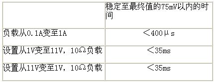瞬態(tài)響應(yīng)的測試需要對負(fù)載阻抗和電源設(shè)置施加較大的階躍變化,并測量穩(wěn)定至最終值的時(shí)間(如表1)。吉時(shí)利全部2200系列電源的電壓瞬態(tài)響應(yīng)都給出了三個(gè)條件:增大負(fù)載,提高設(shè)置和降低設(shè)置。