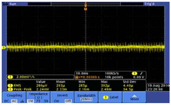 圖6 使用1X探頭和約7MHz帶寬測量噪聲的同時(shí)電源提供全額定電流