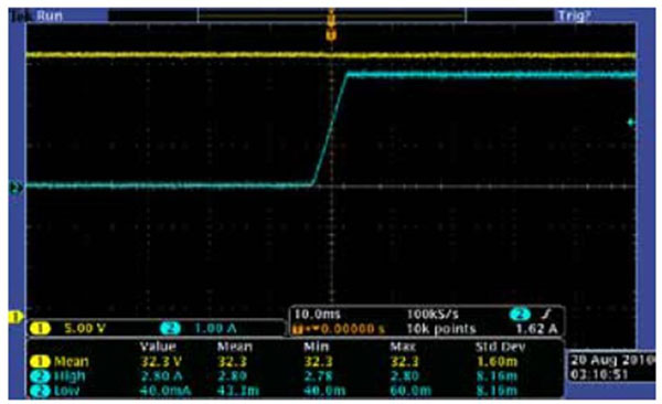 圖4 示波器屏幕顯示了當(dāng)負(fù)載電流從0A變至2.8A時(shí),吉時(shí)利2200-32-3的輸出電壓調(diào)節(jié)。在整個(gè)變化過程中,輸出電壓保持穩(wěn)定