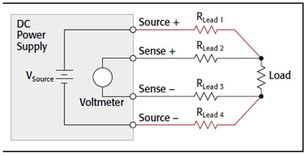 電源與被測器件(DUT)之間承載電流引起的電纜壓降意味著DUT電壓低于電源輸出端電壓。在任意電源條件下,使用較大尺寸線纜能降低測試線壓降。保持電纜盡量短也有幫助。如果電源配備了遠(yuǎn)端感測能力,使用4線連接能確保電源的設(shè)置電壓即為在DUT上得到的電壓。