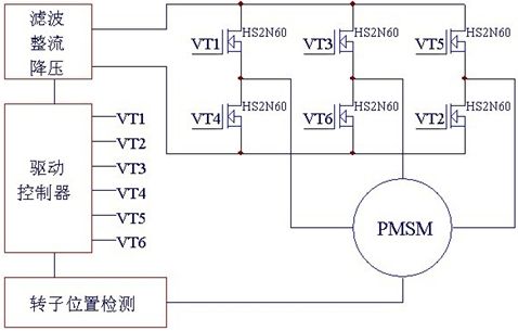 方案中無刷直流電機(jī)(BLDCM)輸入(110V/220V)交流電,經(jīng)轉(zhuǎn)換器(converter)轉(zhuǎn)成直流,要轉(zhuǎn)入電機(jī)線圈前須先將直流電壓由換流器(inverter)轉(zhuǎn)成3相電壓來驅(qū)動(dòng)電機(jī)。換流器(inverter)由6個(gè)功率MOSFET(VT1~VT6)分為上臂(VT1、VT3、VT5)/下臂(VT2、VT4、VT6)連接電機(jī)作為控制流經(jīng)電機(jī)線圈的開關(guān)。MCU提供PWM(脈沖寬度調(diào)制)決定功率MOSFET HS2N60IB開關(guān)頻度及換流器(inverter)換相的時(shí)機(jī)。
