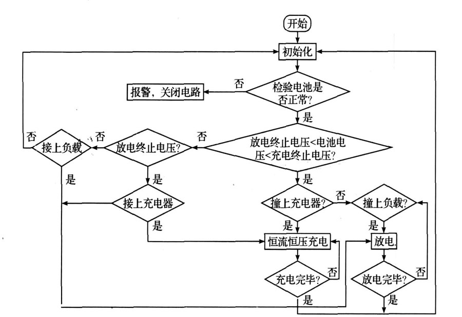程序開(kāi)始執(zhí)行后, 首先進(jìn)行初始化并檢測(cè)電池電壓、電流、溫度等信息是否正常。 如正常則進(jìn)入下一步。 否則報(bào)警并關(guān)閉電路。 如果電池電壓在充電終止電壓和放電終止電壓之間, 說(shuō)明電池既可充電也可放電。 此時(shí)電路將判斷接上充電機(jī)還是接上負(fù)載。 以進(jìn)行相應(yīng)的充電和放電。 如果兩者都沒(méi)有接則循環(huán)檢測(cè)過(guò)程。 若電池電壓已經(jīng)到達(dá)充電終止電壓。 則等待負(fù)載的接入進(jìn)行放電;同樣若電池電壓己經(jīng)達(dá)到放電終止電壓,則等待充電器的接入以進(jìn)行充電。 在整個(gè)過(guò)程中,該電路將始終實(shí)時(shí)檢測(cè)電池信息,若有異常情況發(fā)生,則立即利用中斷信號(hào)終止正在進(jìn)行的充電或者放電過(guò)程,關(guān)斷充放電回路,同時(shí)進(jìn)行報(bào)警并提示報(bào)警原因。