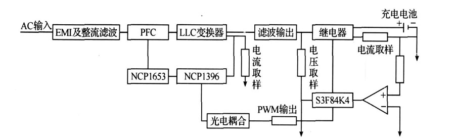 交流電經(jīng)過(guò)濾波整流后,流向NCP1653,由其提供PFC(Power Factor Correction) 操作,NCP1653是一款連續(xù)導(dǎo)通型(CCM) 的功率因數(shù)校正( PFC) 升壓式的上升控制電路, 它的外圍元器件數(shù)量很少,有效地減少了升壓電感的體積, 減小了功率MOS管的電流應(yīng)力,從而降低了成本,且極大地簡(jiǎn)化了CCM 型的PFC 的操作,它還集成了高可靠的保護(hù)功能。 NCP1396 電路為整個(gè)硬件電路提供保護(hù)(包括有反饋環(huán)路失效偵測(cè)、快速與低速事件輸入,以及可以避免在低輸入電壓下工作的電源電壓過(guò)低偵測(cè)等) ,NCP1396 的獨(dú)特架構(gòu)包括一個(gè)500 kHz 的壓控振蕩器,由于在諧振電路結(jié)構(gòu)中避開(kāi)諧振尖峰相當(dāng)重要,因此為了將轉(zhuǎn)換器安排在正確的工作區(qū),NCP1396 內(nèi)置了可調(diào)整且精確的最低開(kāi)關(guān)頻率,通過(guò)專有高電壓技術(shù)支持。 應(yīng)用S3F84K4 單片機(jī)實(shí)現(xiàn)智能充電器控制。