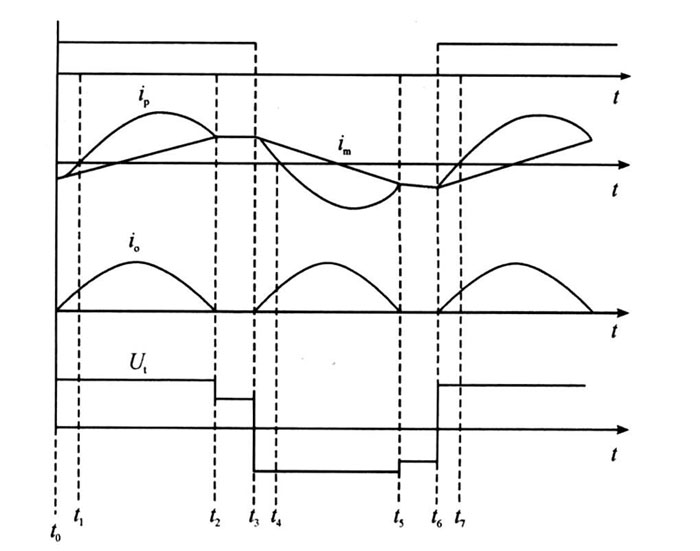 在下半個(gè)周期中, 電路的工作與上半個(gè)周期剛剛相似,只是方向相反。整個(gè)周期的電路工作波形:在上半個(gè)周期中,開(kāi)關(guān)管Q1 為零電壓導(dǎo)通, 而Q1 在t3 時(shí)刻的關(guān)斷電流im 很小; 在下半個(gè)周期中,開(kāi)關(guān)管Q2 為零電壓導(dǎo)通,而Q2 在t6 時(shí)刻的關(guān)斷電流im 很小,所以Q1 、Q2 工作時(shí)的開(kāi)關(guān)損耗很小。