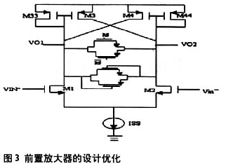 傳統(tǒng)的前置放大器結(jié)構(gòu)如圖2所示,這種內(nèi)置正反饋比較器由一個差分輸入對,一個偽電流源和一對交叉耦臺負載組成,負載連接成差分的模式。M1和M2組成差分輸入對,M3、M33、M4、M44組成帶有正反饋的負載,以提高電路的增益,這個正反饋單元電路可以通過調(diào)整M3、M4和M33、M44管的寬長比(W/L)來形成弱正反饋或強正反饋。