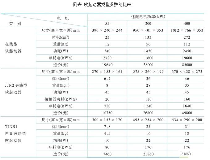 從表中可以看出,旁路型軟起動(dòng)器優(yōu)于在線型軟起動(dòng)器,而內(nèi)置旁路型軟起動(dòng)器的優(yōu)于旁路型和在線型軟起動(dòng)器。但價(jià)格卻是越先進(jìn),成本越低,這是高科技的一般規(guī)律。以附表內(nèi)舉例品牌來比較,在線型軟起動(dòng)器是旁路型軟起動(dòng)器的1.5倍,旁路型軟起動(dòng)器的是內(nèi)置旁路型軟起動(dòng)器的1.4倍(不算接觸器的價(jià)格)。而能耗比較,在線型軟起動(dòng)器是旁路型軟起動(dòng)器的10倍左右,而旁路型軟起動(dòng)器的是內(nèi)置旁路型軟起動(dòng)器的7倍左右。