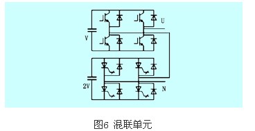 為了輸出更多的電平,減少隔離電源數(shù)量,每個(gè)單元電路結(jié)構(gòu)可以不完全相同,串聯(lián)單元本身還可以是一個(gè)多電平逆變器,如二極管箝位型逆變器,或飛跨電容箝位型逆變器。這種由不同結(jié)構(gòu)單元串聯(lián)而成的逆變器稱(chēng)為混聯(lián)型逆變器,如圖5(b)所示。如果需要三相,則可以用三組這樣的混聯(lián)單元按照?qǐng)D5(a)所示連接方法相連。實(shí)際中,由于級(jí)聯(lián)多電平主要用于高壓大功率,為了充分發(fā)揮不同類(lèi)型器件的優(yōu)點(diǎn)(高壓和高頻),同一組(相)相串聯(lián)的不同的逆變單元中常常使用不同的器件,這種連接方式也稱(chēng)為混聯(lián),如圖6所示,igbt和igct的混聯(lián)型逆變單元,igbt工作于相對(duì)較高的頻率,較低的電壓;而igct工作于相對(duì)較高的電壓,較低的頻率。