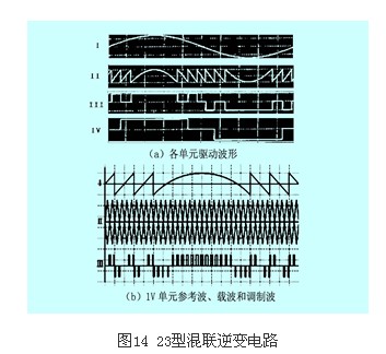 本方法主要針對(duì)非對(duì)稱(chēng)混聯(lián)逆變電路。為了實(shí)現(xiàn)輸出電壓波形的連續(xù)調(diào)幅,需要對(duì)多電平電路進(jìn)行pwm控制。同時(shí)為了降低脈沖階躍幅度帶來(lái)的電磁干擾,連續(xù)調(diào)幅時(shí)產(chǎn)生的脈沖不超過(guò)1v。圖14為23型3級(jí)h橋非對(duì)稱(chēng)混聯(lián)逆變電路(三個(gè)級(jí)聯(lián)單元的直流電壓比為1:2:4)的混合pwm調(diào)制方法示意圖。首先對(duì)電壓為2v和4v單元按圖14(a)中的iii、iv波形進(jìn)行驅(qū)動(dòng),然后將i中正弦調(diào)制波和iii、iv波形相減,得到1v單元的調(diào)制波ii。再用ii和三角載波進(jìn)行調(diào)制,形成1v單元的pwm驅(qū)動(dòng)波形,如圖14(b)所示。顯然,該法只對(duì)1v單元進(jìn)行了pwm調(diào)制,因此在選擇器件時(shí),就可以在2v和4v單元使用低頻大功率器件,如igct;而在1v的pwm單元采用高頻小功率器件。