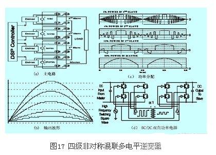 有些學(xué)者為非對(duì)稱(chēng)混聯(lián)多電平逆變電路提出了主從逆變單元的概念。主逆變單元(master)就是串聯(lián)連接的逆變器中,直流電壓最高的單元,它承擔(dān)級(jí)聯(lián)逆變器大多數(shù)的功率,通常由gto、igct完成,同時(shí)通過(guò)dc/dc雙向功率電源向從逆變單元(slave)供電。其它的逆變單元稱(chēng)為從逆變單元,直流電壓較低,只負(fù)責(zé)完成自己的逆變?nèi)蝿?wù)。圖17所示為(a)(b)(c)(d)分別為4級(jí)連接81電平的逆變器主電路、輸出波形、功率分配情況及dc/dc雙向功率電源。