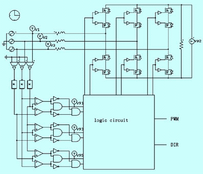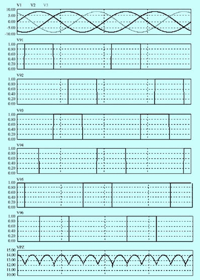 虛擬整流技術(shù)的實(shí)現(xiàn),主要通過(guò)三相同步檢測(cè)電路取得同步控制信號(hào),然后控制功率器件來(lái)模擬二極管橋式整流電路對(duì)三相交流電進(jìn)行整流,同時(shí)防止輸入的三相交流電相間短路。其原理如圖9所示,是一個(gè)輸出方向固定的虛擬整流電路。仿真波形如圖5所示,它們分別是矩陣變換單元的三相輸入電壓、6路同步信號(hào)和虛擬整流后得到的輸出電壓波形。