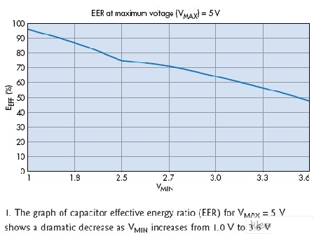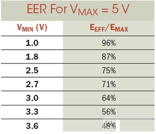 其中EMAX代表電容器存儲的總能量。等式2明確表明,隨著我們通過減少電容器內(nèi)的駐留電能,而降低了被供電電路的最低工作電壓VMIN,有效能效比可獲得極大地提升。對任何以電容供電的電路來說,能效比都是一個非常重要的設(shè)計考慮。