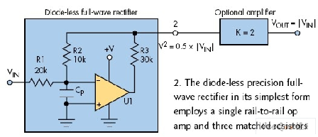 圖2:最簡單的無二極管精精密全波整流器采用單個軌至軌運算放大器和三個匹配的電阻?! ?/p>