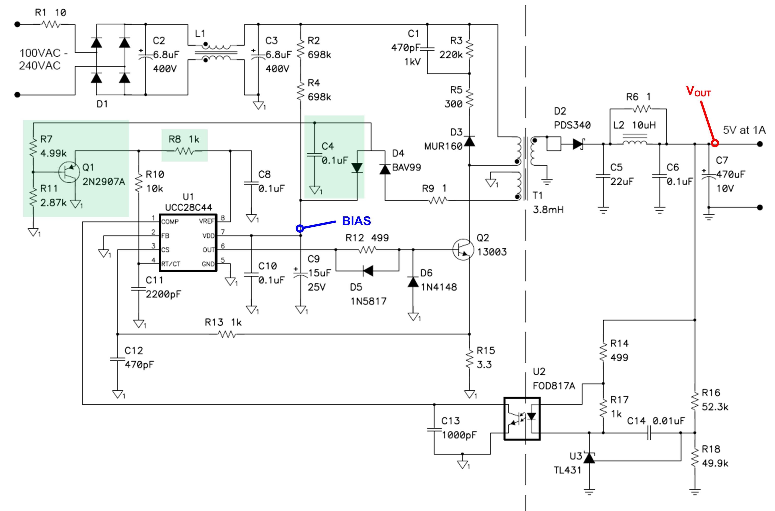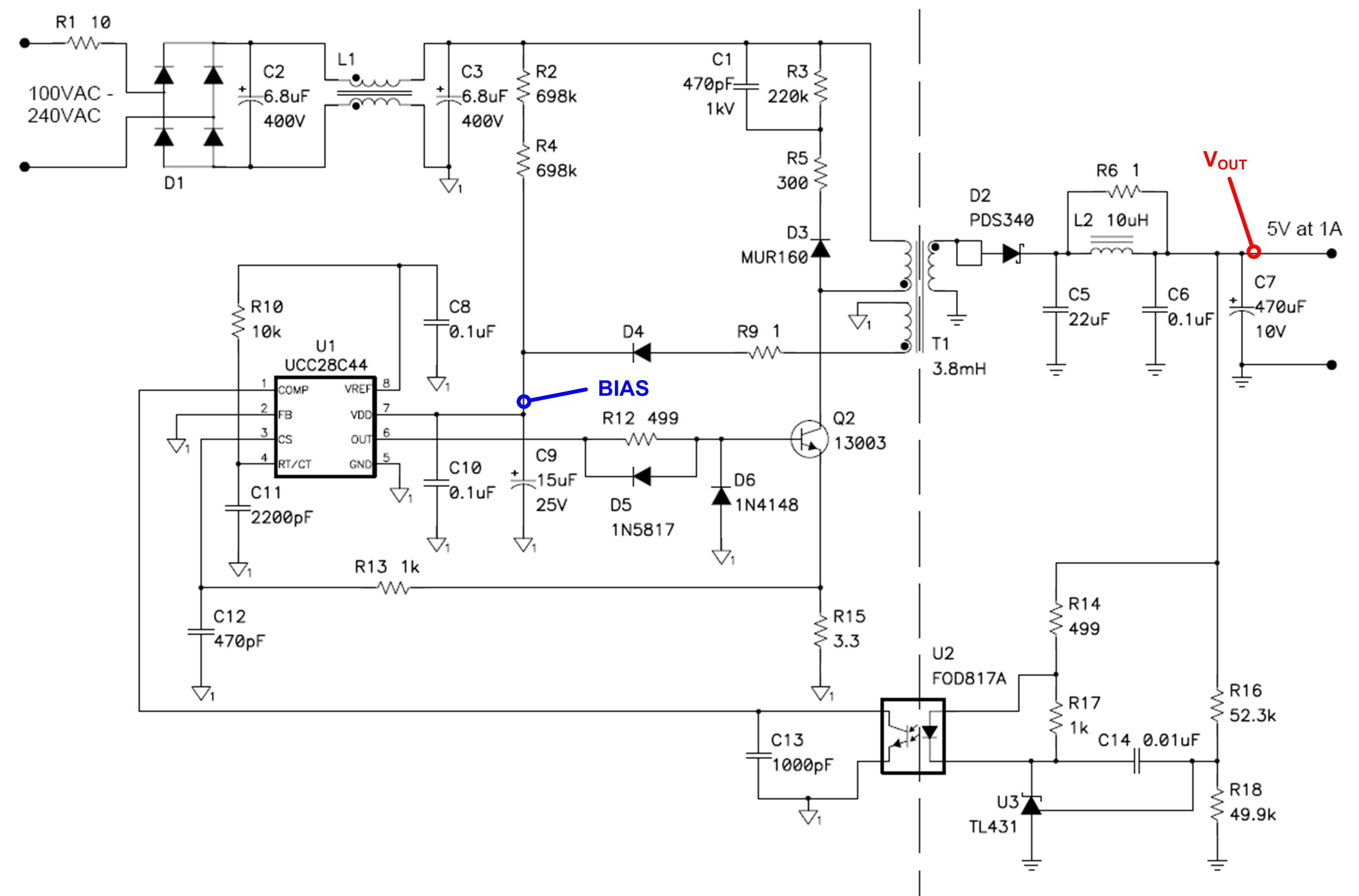 圖 2 這種5V/5W反向通過限制峰值變壓器電流實(shí)現(xiàn)功率限制。