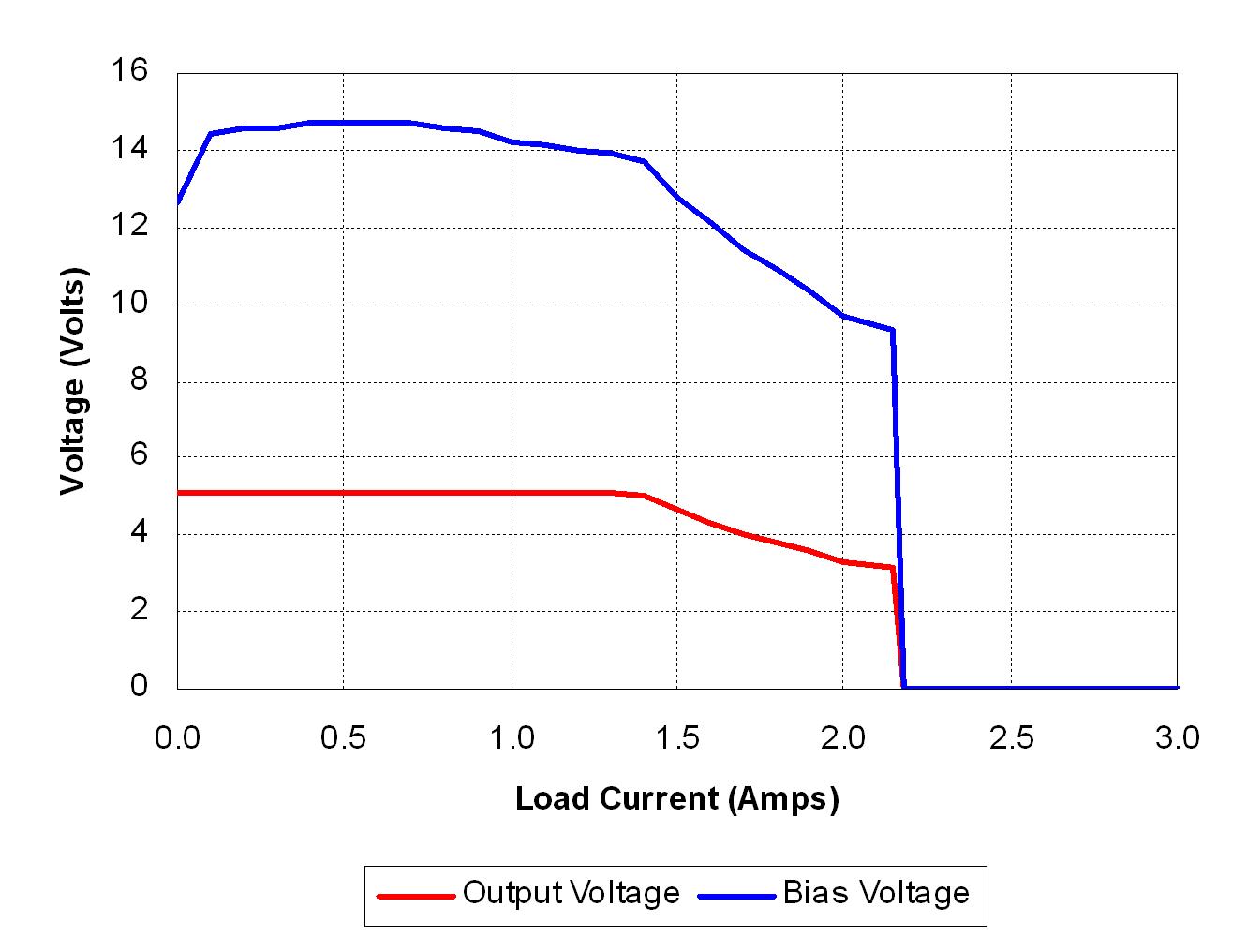 圖3顯示了輸出和偏置電壓與圖2所示電路負(fù)載電流的對(duì)比情況。輸出V-I特性非常接近于圖1所示理想情況。負(fù)載電流達(dá)到約1.3A時(shí)開始功率限制。隨著負(fù)載增加,輸出電壓開始下降。由于偏置電壓是輸出電壓的反映,因此它也開始下降。偏置電壓降至9V關(guān)閉水平以下時(shí),PWM控制器關(guān)閉。