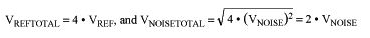 多個(gè)基準(zhǔn)源串聯(lián)可以降低LF噪聲。使用多個(gè)電壓源(每個(gè)電壓源等效于一個(gè)直流源和一個(gè)噪聲源)時(shí),直流電壓線性增加,噪聲源(如果非相關(guān))則是以RMS幾何求和。例如,使用四個(gè)基準(zhǔn)源,每個(gè)基準(zhǔn)源等效于一個(gè)VREF基準(zhǔn)和一個(gè)VNOISE噪聲,則產(chǎn)生如下輸出: