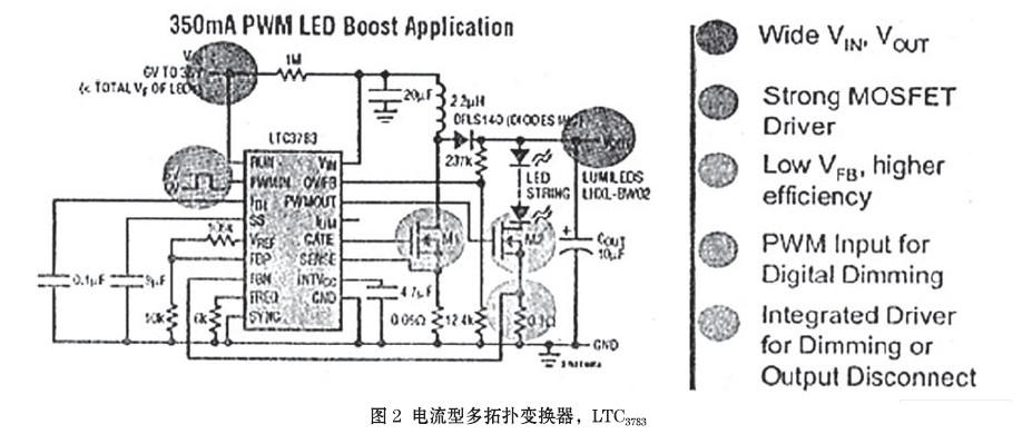 裝有LTC3783 LED驅動器在汽車上應用時,具有以下很重要的特點:(1)大電流、為輸出大的電流(≥1.5A),LTC3783驅動外部的N溝道MOSFET,可給高亮度(HB)和超高亮度(SHB) LED供電;(2)高電壓、LTC3783 3V~36V的輸入運作和輸出電壓,取決于外部功率元件的選擇,這可按標準確定,易于驅動LED燈串或混串(串+并);(3)保護。對HB LED的保護,需要IC結合精確的電流和輸出電壓調(diào)節(jié)。附加保護包括過電壓、過電流和軟啟動;(4)調(diào)光、以純色PWM3000∶1數(shù)字式調(diào)光時,在寬廣的調(diào)光比下保持LED恒定的顏色。而且,LTC3783還能附加模擬100∶1的調(diào)光。
