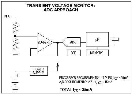 如果軟件比較具有高效編碼并且ADC無需處理器干預(yù),系統(tǒng)每次采樣可執(zhí)行少于10條指令,這就要求處理器具有4MIPS的能力。這種執(zhí)行能力并不適合采用電池供電(圖1)。需要考慮用模擬方法對(duì)輸入瞬態(tài)偏離進(jìn)行響應(yīng),用以替代連續(xù)跟蹤方案?! ?br />
