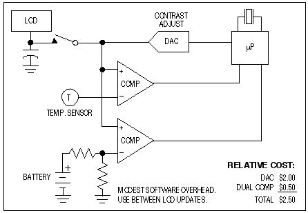 另外一種方法就是用一個(gè)低成本雙路DAC替代現(xiàn)有單路DAC.雙路DAC中的一路用于產(chǎn)生LCD對(duì)比度電壓,另一路用于構(gòu)成ADC.無論單路還是雙路,都需要DAC和比較器支持快速、驅(qū)動(dòng)DAC的簡(jiǎn)單程序,以及對(duì)比較器采樣來實(shí)現(xiàn)逐次逼近(參見sidebar,逐次逼近)。