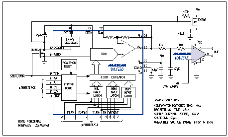 當(dāng)前比較器都能夠很好地處理擺率受限的輸入信號(hào)。例如,Maxim公司的MAX913和MAX912在這方面尤其有效,因?yàn)樗鼈冊(cè)诰€性工作區(qū)能夠確保穩(wěn)定。圖5列舉了MAX913在高速、12位應(yīng)用中的性能。圖6電路(超低功耗8位轉(zhuǎn)換器)在不使用時(shí)可將其關(guān)閉以節(jié)省能量。