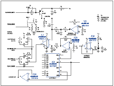 圖8中比較器(IC3)采用單電源供電、地電位檢測(cè)以及僅10ns傳輸延遲。DAC (IC4)為雙通道器件,一方面用于脈沖高度測(cè)量,另一方面驅(qū)動(dòng)LCD對(duì)比度控制(如圖3)。注意DAC為反向驅(qū)動(dòng);電流輸出端連接在一起由經(jīng)過緩沖的電壓基準(zhǔn)驅(qū)動(dòng),基準(zhǔn)輸入作為電壓輸出(每路帶有一個(gè)外部放大器緩沖)?! ?br />