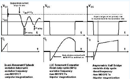 圖1所示為采用三種不同拓?fù)?準(zhǔn)諧振反激式拓?fù)?、LLC諧振拓?fù)浜褪褂密涢_關(guān)技術(shù)的非對稱半橋拓?fù)?的開關(guān)的電壓和電流波形。