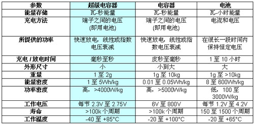 與電池相比,超級電容器能提供更大的峰值功率,具有更小的外形尺寸,在更寬的工作溫度范圍內(nèi)具有更長的充電周期壽命,還具有更低的等效串聯(lián)電阻 (ESR),可提供更高的功率密度。與標(biāo)準(zhǔn)陶瓷、鉭或電解質(zhì)電容器相比,超級電容器以類似的外形尺寸和重量,提供更高的能量密度。通過降低超級電容器的 Top-Off 電壓,并避開高溫 (>50°C),可以最大限度地延長超級電容器的壽命。下表 1 比較了超級電容器、電容器和電池的關(guān)鍵特點(diǎn)。