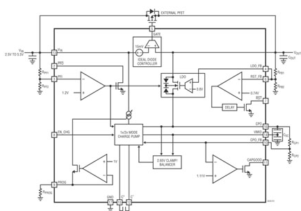 任何可高效地滿足上述小到中電流超級電容器充電器 IC 設(shè)計(jì)限制的解決方案都會包括一個面向兩節(jié)串聯(lián)超級電容器和基于充電泵的充電器以及自動容量平衡和電壓箝位。凌力爾特已經(jīng)為這類應(yīng)用開發(fā)出了一個簡單但尖端的單片超級電容器充電器 IC,該 IC 不需要電感器,也不需要平衡電阻器,提供了反向隔離,并有多種工作模式,而且靜態(tài)電流還很低。