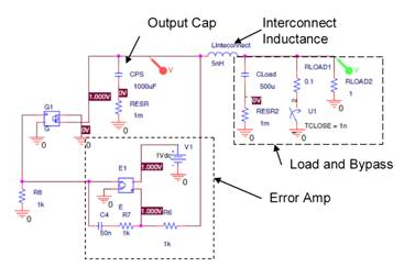 為了討論方便,圖1顯示了電源系統(tǒng)的P-SPICE模型。本圖由補(bǔ)償電路電源、調(diào)制器(G1)和輸出電容器組成。內(nèi)部還包括互連電感、旁路電容負(fù)載模型、DC負(fù)載和步進(jìn)負(fù)載。