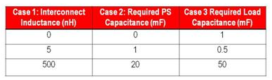 表1對(duì)舉例系統(tǒng)三個(gè)互連電感的要求電容器進(jìn)行了比較。通過改變互連電感、計(jì)算負(fù)載旁路電容并設(shè)計(jì)電源的相應(yīng)輸出級(jí)和控制環(huán)路,得到比較數(shù)據(jù)。案例1的負(fù)載和電源并列放置;案例2電源和負(fù)載之間的互連電感大小為中等。案例3中,使用線纜連接的電源的電感極高。要求旁路的多少直接與互連電感有關(guān)。