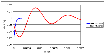 圖 2 對(duì)小和大互連電感的負(fù)載瞬態(tài)期間的輸出電壓變化模擬情況進(jìn)行了比較。小電感響應(yīng)快速漸次減弱,而大電感則并非如此,花費(fèi)了較長的時(shí)間才穩(wěn)定下來。這是由于特性阻抗更高以及諧振頻率更低。另外,如果負(fù)載電流在該諧振頻率有規(guī)律地跳動(dòng),則會(huì)出現(xiàn)極寬且具破壞性的電壓變化。