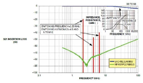 圖1比較了一個(gè)采用100MHz時(shí)電阻為68Ω的Murata EMI濾波器的傳統(tǒng)鐵氧體磁環(huán)插入損耗。電源電路有低的阻抗,在50Ω環(huán)境下測(cè)出插入損耗。因此,電源濾波器的插入損耗量值可能有少許差異,雖然諧振頻率并不變化。