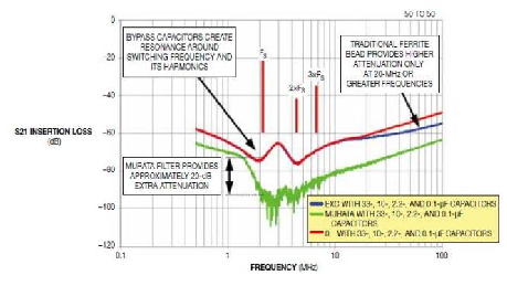 電源濾波器中的其它元件是旁路電容。選擇這些電容值時(shí),應(yīng)使它們的諧振頻率(產(chǎn)生一個(gè)接地的低阻抗路徑)接近于開(kāi)關(guān)頻率。這樣,通過(guò)磁環(huán)的開(kāi)關(guān)噪聲就被短路到地。圖2的電源濾波器插入損耗比較表明,正確的旁路電容值可產(chǎn)生一個(gè)接近于開(kāi)關(guān)頻率的諧振,即使是用于一只傳統(tǒng)鐵氧體磁環(huán),如EXCML32A680.不過(guò),在低頻時(shí),如果將其與一只0Ω電阻放在一起,就沒(méi)有那么大差異了。另一方面,Murata EMI濾波器提供了圍繞開(kāi)關(guān)頻率的大約20dB額外衰減。圖3中的電源濾波器使用了一只33μF鉭電容做寬頻去耦,而10μF、2.2μF和 0.1μF的陶瓷電容則有狹窄的諧振頻率。