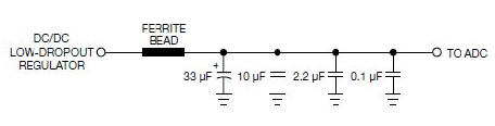 隔離來(lái)自ADC開(kāi)關(guān)噪聲的一個(gè)關(guān)鍵元件是電源濾波器,它包括一個(gè)鐵氧體磁環(huán)和旁路電容。在選擇鐵氧體磁環(huán)時(shí)應(yīng)考慮多個(gè)關(guān)鍵特性。首先,鐵氧體磁環(huán)必須有用于數(shù)據(jù)轉(zhuǎn)換器的充足額定電流,它必須有低的DCR(直流阻抗),以盡量減少磁環(huán)自身的壓降。例如,當(dāng)一個(gè)200mA電源通過(guò)一個(gè)DCR為1Ω的磁環(huán)時(shí),產(chǎn)生一個(gè)200mV的壓降。這個(gè)壓降可能將ADC上的電壓推至邊沿,考慮到電源電壓的標(biāo)準(zhǔn)差,ADC電壓甚至可能低于建議的工作電壓?! ?br />