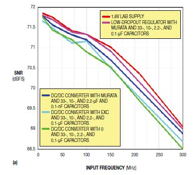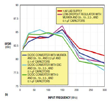圖4,這些SNR(a)和SFDR(b)掃頻圖比較了一個(gè)用低壓差穩(wěn)壓器的基準(zhǔn)電源(如1.8V的實(shí)驗(yàn)室用干凈電源),以及一個(gè)采用ADS4149評(píng)估模塊、有不同電源濾波器選項(xiàng)的DC/DC轉(zhuǎn)換器。
