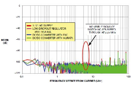 測(cè)試結(jié)果表明,在300MHz的中間頻率下,當(dāng)用開(kāi)關(guān)穩(wěn)壓器供電時(shí),SNR性能比低噪聲低壓差穩(wěn)壓器下降了大約0.3dB.而各種方式的SFDR性能幾乎相同。通過(guò)仔細(xì)觀察正態(tài)化的FFT圖(開(kāi)始于輸入信號(hào),繪制的是噪聲與偏移頻率關(guān)系圖),表明當(dāng)使用次優(yōu)的EXC鐵氧體磁環(huán)時(shí),整個(gè)Nyquist區(qū)中的背景噪聲略有升高,而沒(méi)有任何開(kāi)關(guān)頻率饋入的跡象(圖5)。