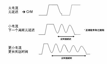 具體講,CCFF架構具有固定導通時間控制和頻率反走特性。在大電流時,電路以臨界導電模式工作。小電流時(重負載時接近線路過零點,輕載時位于全部正弦方波),因此,磁芯復位后下一個周期并不會立即啟動;相反,定時器開始調(diào)節(jié)死區(qū)時間;電流越小,定時器持續(xù)時間(死區(qū)時間)越長;定時器持續(xù)時間取決于大?。欢〞r器僅控制死區(qū)時間(不控制開關周期/關閉時間)。由于死區(qū)時間不受電流周期時長變化的影響,因此可以毫不猶豫地進行谷底導通。