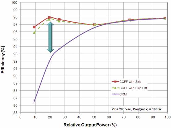 采用CCFF控制架構,最大的好處莫過于提升能效。采用傳統(tǒng)CrM(臨界導電模式)/BCM(邊界線導電模式),在負載降低時,開關頻率上升;負載極低時,控制器可能進入“跳周期模式”,滋生可聽噪聲。而采用CCFF控制架構,可以在負載降低時降低開關頻率,減小功率損耗;在輕載時,控制器可以鉗位高于可聽噪聲頻段的較低頻率;負載極低時,則采用跳周期模式工作(可以輕易關閉)。因此,這種谷底導通可進一步提升能效,減小電磁干擾。圖4比較了基于NCP1611CCFF PFC及傳統(tǒng)CrM PFC在不同負載條件下的能效。由圖中可見,在10%輕載條件下,基于帶跳周期模式的NCP1611的演示板的能效高達近97%(關閉跳周期模式下也達近96%),而基于傳統(tǒng)CrM架構的演示板能效僅為近87%,相關近10%。可見NCP1611在提升電源輕載能效方面表現(xiàn)尤為優(yōu)異。
