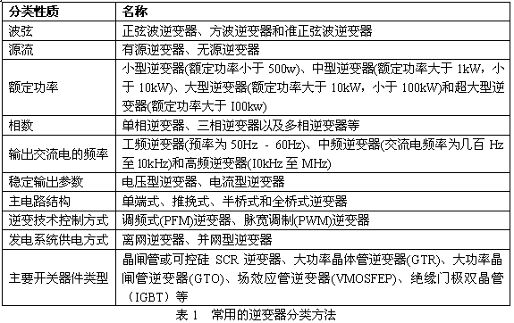 逆變器的分類方法很多,表1是常用的逆變器分類方法: