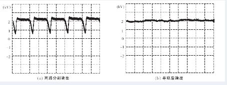 圖6 中所標(biāo)的電壓值為乘以分壓器變比以后的值。圖6(a) 為沒有經(jīng)過并聯(lián)的兩路分別輸出時(shí)的電壓波形,可以看到,單路電壓輸出存在缺口,而且缺口處脈動(dòng)較大,并有一定的毛刺。圖中6(b)為兩路并聯(lián)后輸出的電壓波形(未經(jīng)電容濾波),與圖6(a)相比較,可以清楚地看到兩路并聯(lián)后,大的缺口在輸出波形中消失,輸出電壓脈動(dòng)明顯減小,紋波變低,達(dá)到了實(shí)驗(yàn)?zāi)康?,?yàn)證了設(shè)計(jì)思想的正確性。
