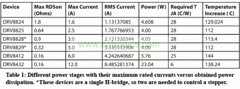 但是,利用更大的功率級(jí),可以讓RDSon變得更小。這便是DRV8825的工作原理。0.64歐姆高端到低端的RDSon最大時(shí),可以讓芯片溫度保持更低的同時(shí)提供更多的電流。如果使用了更大的功率級(jí),且RDSon參數(shù)越來(lái)越小,則有望獲得更大的電流容量。表1顯示了使用不同器件時(shí)的各種電流容量。