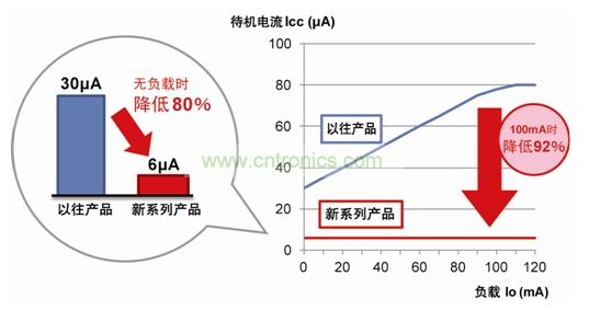 與以往產(chǎn)品相比,待機電流降低80%。而且,即使負載電流增加,新系列產(chǎn)品亦可維持6μA的待機電流,因此在負載100mA時,待機電流可降低92%。