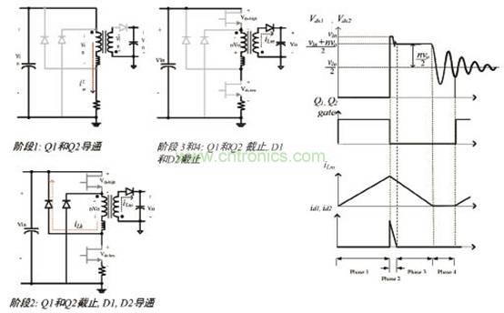 雙管反激與單管反激的基本原理相似,只是多了一個(gè)階段2。階段1、3、4與零諧振單管反激的工作原理相同。階段1: Q1和Q2同時(shí)導(dǎo)通,變壓器的電感電流將會(huì)線性增加并將能量?jī)?chǔ)存于變壓器中;當(dāng)2個(gè)MOS管關(guān)閉時(shí)候就進(jìn)入階段2;階段2:因?yàn)槁└兴纬傻母呗┰措妷簳?huì)導(dǎo)致2個(gè)回收二極體導(dǎo)通,Q1和Q2截止,D1,D2導(dǎo)通;當(dāng)漏感能量回收完畢,進(jìn)入階段3;階段 3和4: Q1和Q2 截止,D1和D2截止。