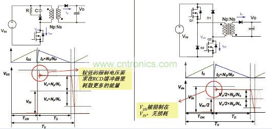 雙管反激的好處之一就是減少能量損耗。無(wú)緩沖器損耗和發(fā)熱問(wèn)題,漏電感能量可回收在大容量電容器中。