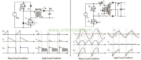 雙管QR反激與LLC諧振轉(zhuǎn)換器如圖4所示,左邊為雙管QR反激,右邊為L(zhǎng)LC諧振轉(zhuǎn)換器等特點(diǎn)。