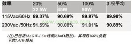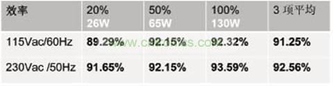 19V/90W輸出的適配器,這個(gè)適配器高16.5mm,長(zhǎng)95mm,寬60mm,在這么一個(gè)薄小的設(shè)計(jì)卻能達(dá)到較好的效率,如表2所示。130W/19V一體機(jī)PC電源效率如表3所示。130W/19V一體機(jī)PC電源效率如表3所示。200W/19V 一體機(jī)PC電源效率如表4所示。