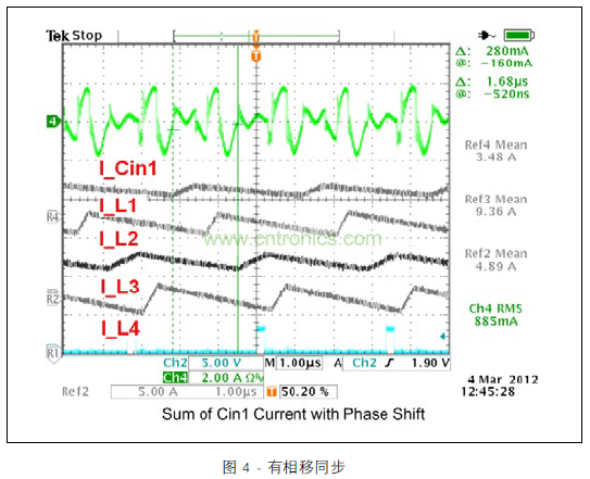 圖 3 顯示的范圍圖片涵蓋所有四個(gè)開(kāi)關(guān)階段中的電感器電流與去耦合通道 1 的輸入電容器的脈沖電流。