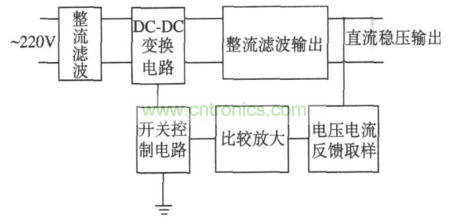 開關(guān)直流穩(wěn)壓電源是基于方波電壓的平均值與其占空比成正比以及電感、電容電路的積分特性而形成的。其基本工作原理是,先對輸入交流電壓整流,從而形成脈動(dòng)直流電壓,經(jīng)過DC-DC 變換電路變壓,再通過斬波電路形成了不同脈沖寬度的高頻交流電,然后對其整流濾波輸出需要電壓電流波形。如果輸出電壓波形偏離所需值,便有電流或電壓采樣電路進(jìn)行取樣反饋,經(jīng)過與比較電路的電壓值進(jìn)行參數(shù)比較,把差值信號放大,從而控制開關(guān)電路的脈沖頻率f 和占空比D,以此來控制輸出端的導(dǎo)通狀態(tài)。因此,輸出端便可以得到所需的電壓電流值。